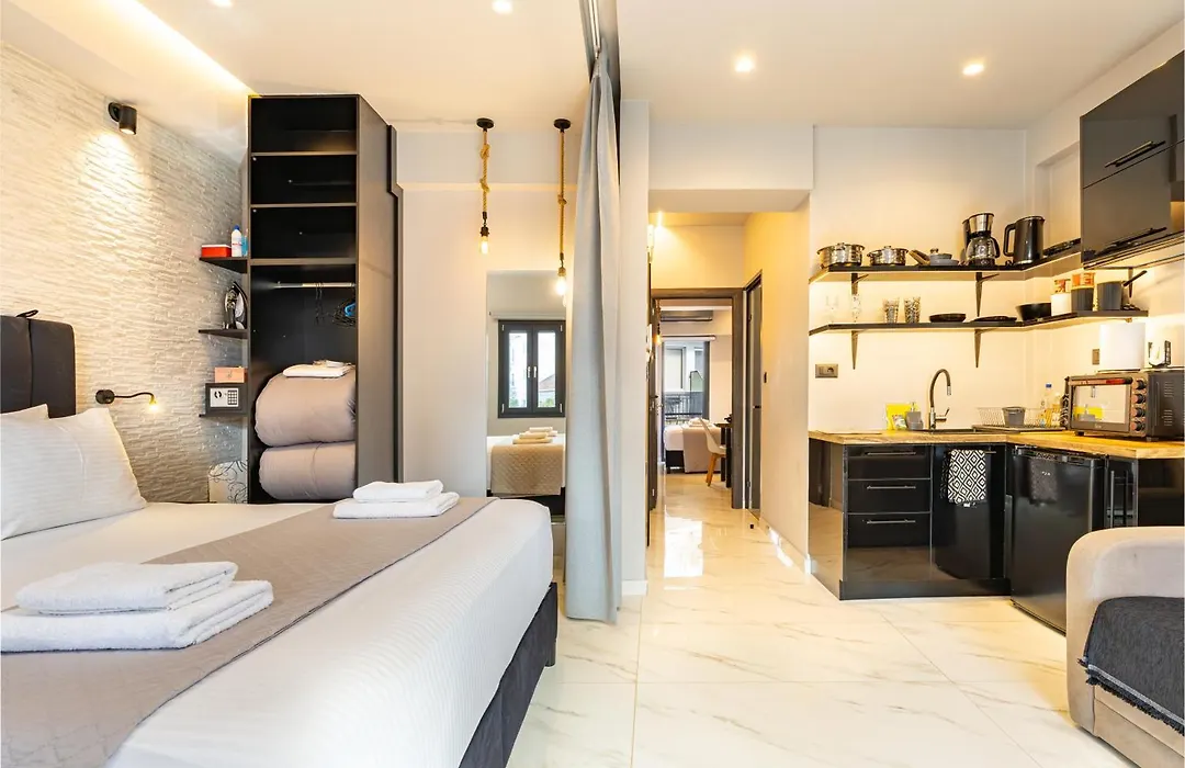Urban Luxury Apt In Chania Centre设有小厨房和配梳妆室,沙发 和咖啡/茶设施的客房. 驾车17分钟就可以到绍达机场,公寓距离Markou Mpotsari公交车站100米.